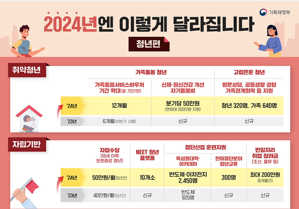 2024년부터 달라지는 지원금과 관련된 대표적인 주요 정책은 다음과 같습니다.