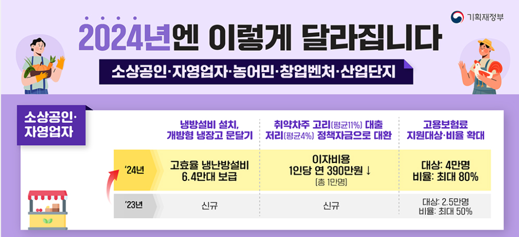 : 고금리 대출을 저금리 정책 자금으로 대환해 주는 제도가 신설되어 1인당 평균 연 390만 원의 이자를 줄일 수 있게 됩니다. 이는 소상공인 및 자영업자의 경제적 부담을 덜어줄 것으로 기대됩니다.