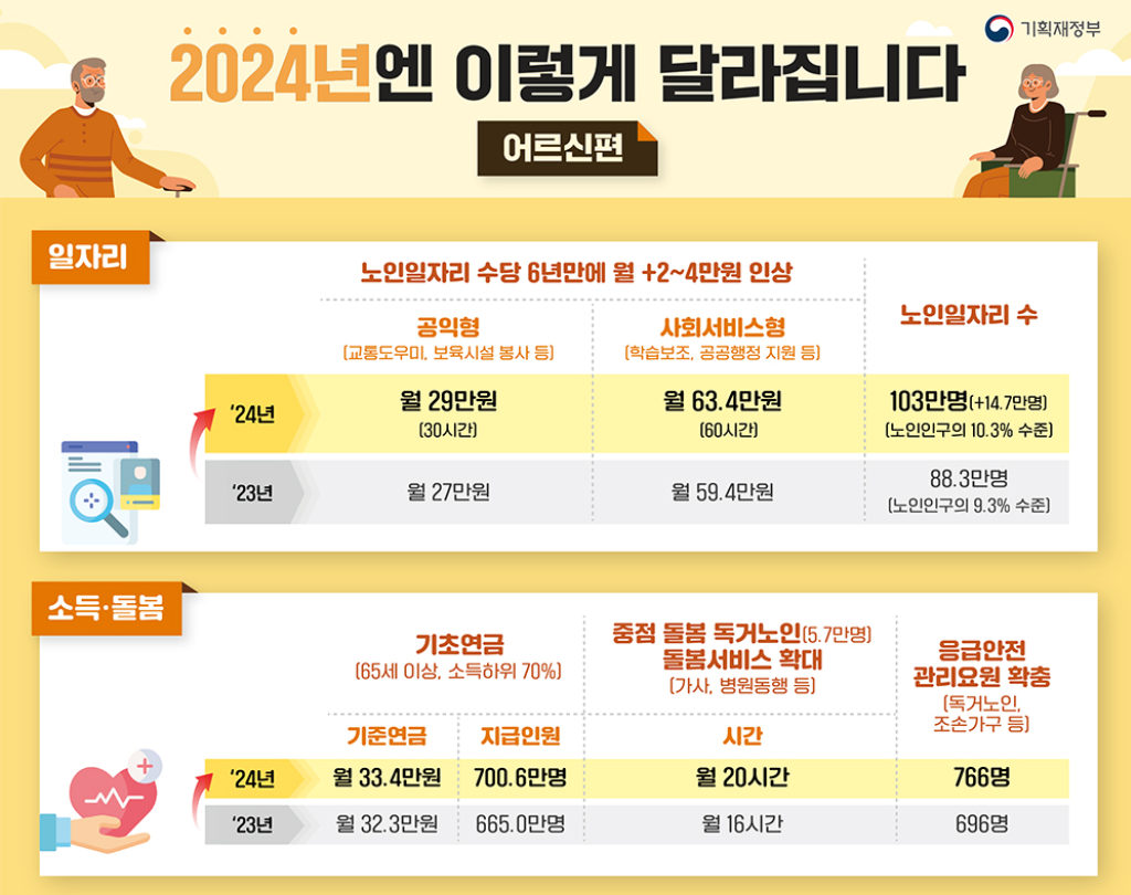 : 88만 3천 명에서 103만 명으로 증가하며, 공익형 일자리 수당은 월 27만 원에서 29만 원으로 인상되고, 사회 서비스형 일자리 수당은 월 59만 4,000원에서 63만 4,000원으로 인상됩니다. 이는 어르신들의 사회 참여와 경제적 자립을 위한 것으로, 어르신들의 삶의 질 향상에 도움이 될 것으로 기대됩니다.