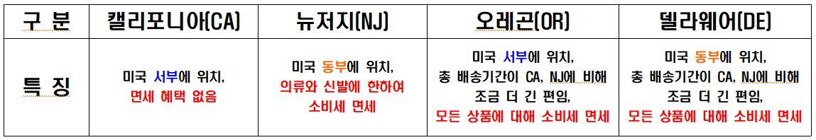 구매하는 상품에 적합한 배송대행지(배대지)를 선택하는 것도 중요합니다. 동일한 국가 내라고 할지라도 지역에 따라 소비세 등의 세금 기준이 다른 경우가 있습니다. 특히 미국의 경우 주마다 현지 소비세가 다르게 부과되어 주문한 상품에 따라 어떤 배대지를 선택하느냐가 배송기간과 배송비 등에 영향을 주므로 배대지의 신중한 선택이 필요합니다.
