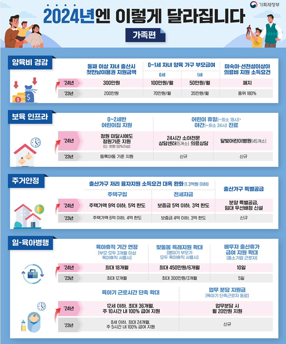 : 둘째 이상 자녀 출산 시 지원되는 천 만남 이용권은 200만 원에서 300만 원으로 인상됩니다. 이는 출산율을 높이는 데 도움이 될 것으로 기대됩니다. - 육아휴직 기간